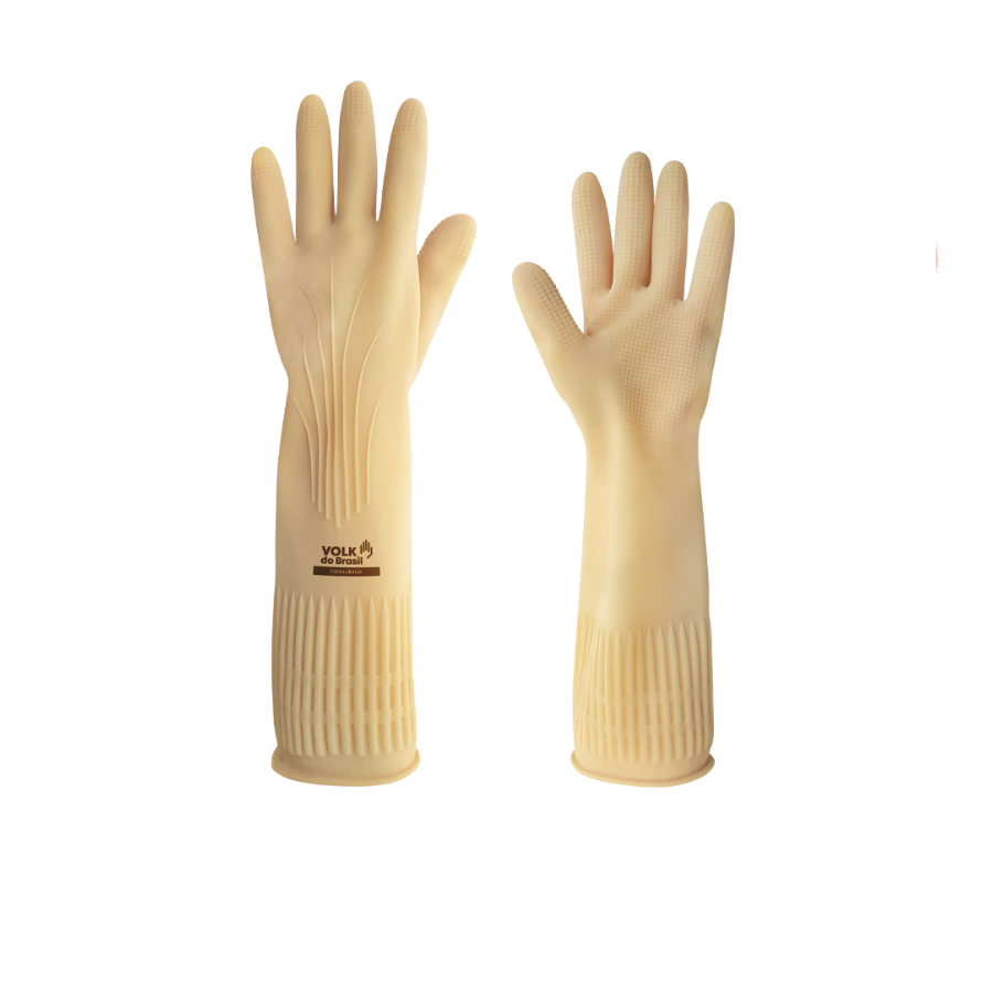 Luva de segurança confeccionada em látex natural, relevo antiderrapante na palma e ponta dos dedos, detalhes de ranhura no punho.